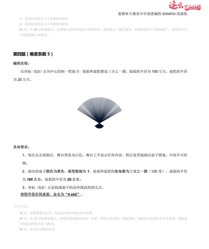 今天我们来继续做第十届scratch蓝桥杯的编程大题。第四题---画扇子,scratch的画笔模块是蓝桥杯一个考试重点。每一套题一定会出! 解析: