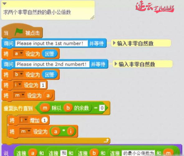 Scratch巧解数学题——求最小公倍数。题:求两个非零自然数a和b的最小公倍数。比如,求12和15的最小公倍数。我们知道,求两个数的最小公倍数一般采用列举法。列举法对于人工来说比较繁琐,但是通过编程让计算机来计算就非常容易。